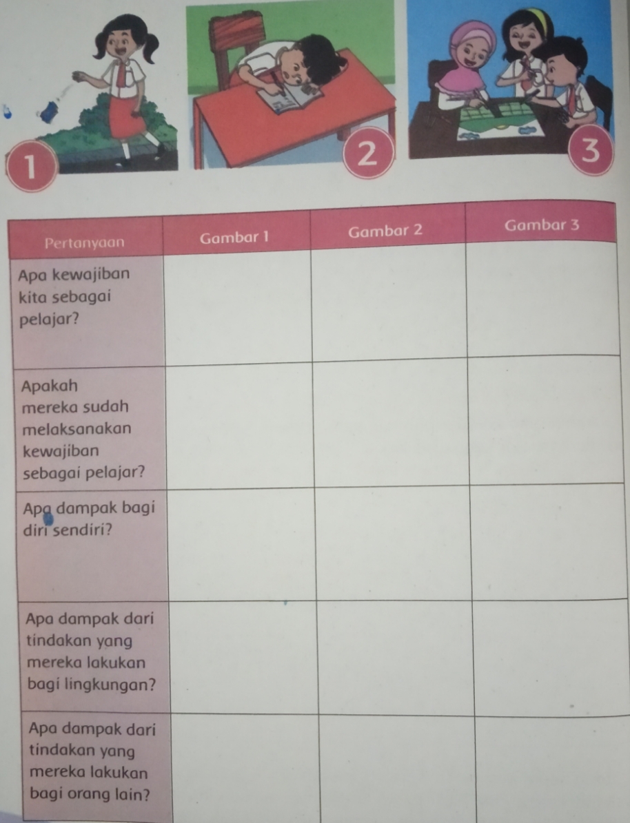 Dari gambar 1, 2, dan 3 nanti kalian jawab pertanyaannya pada kolom yang sesuai.
